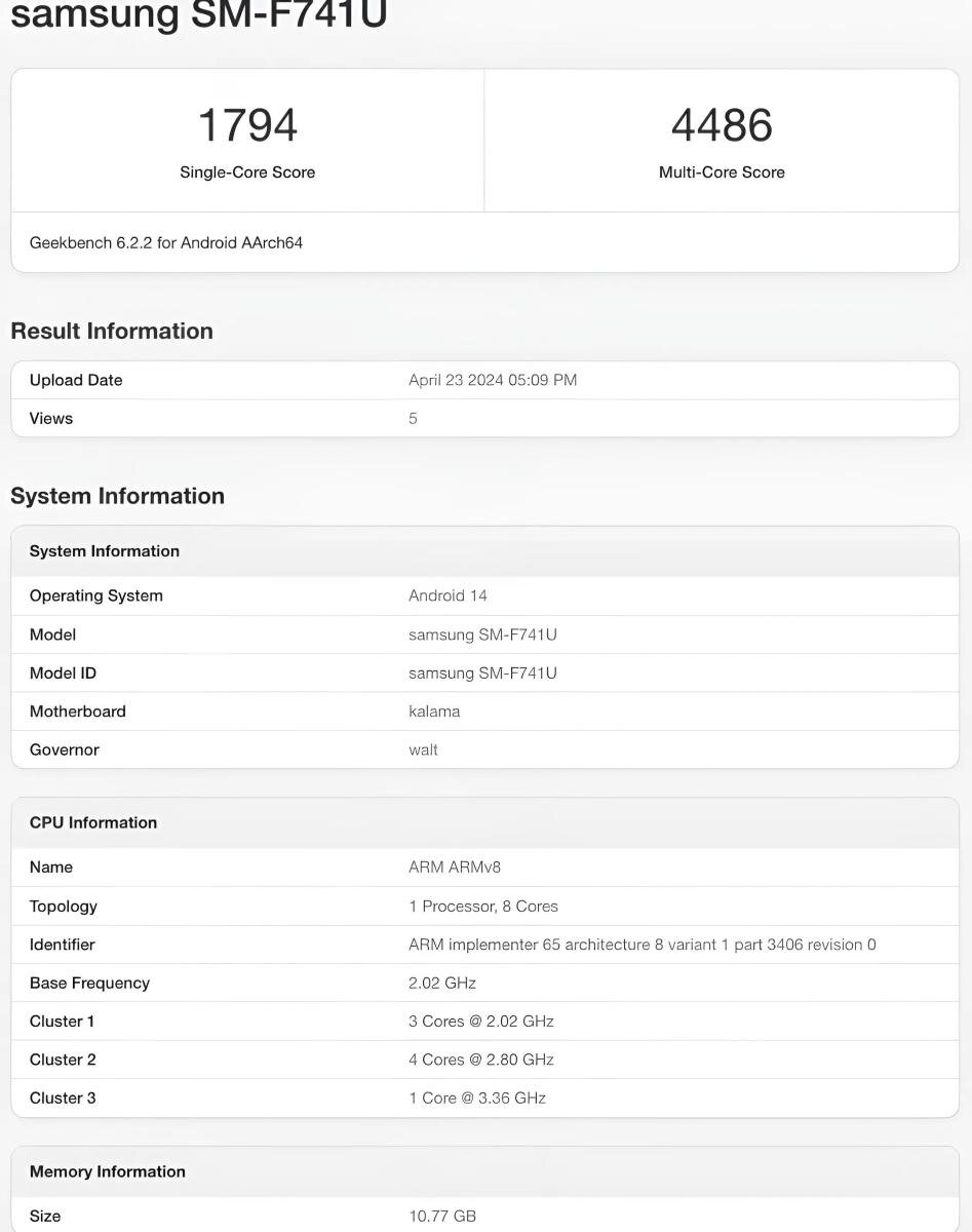 В течение нескольких месяцев Samsung может представить складные телефоны нового поколения - Galaxy Z Flip 6 и Galaxy Z Fold 6. Ожидается, что в обоих телефонах будут использоваться новейшие чипы Qualcomm Snapdragon. Однако у Samsung могут быть другие планы, поскольку она тестирует Z Flip 6 с устаревшим чипом. Несколько дней назад американская версия Galaxy Z Flip 6 (SM-F741U) была замечена в базе данных Geekbench с процессором Snapdragon 8 Gen 3 (кодовое название Pineapple) и 8 ГБ оперативной памяти. А теперь эта же модель была замечена с процессором Snapdragon 8 Gen 2 (кодовое название Kalama) и 12 ГБ оперативной памяти. Как видно на скриншоте выше, Galaxy Z Flip 6 работает под управлением Android 14, как и ожидалось, набрав 1 794 балла в тесте Geekbench 6 на одноядерную производительность и 4 486 баллов в тесте на многоядерную производительность. Это немного странно, поскольку Samsung почти всегда использует новейшие чипы Snapdragon в своих складных телефонах. Похоже, Samsung тестиру