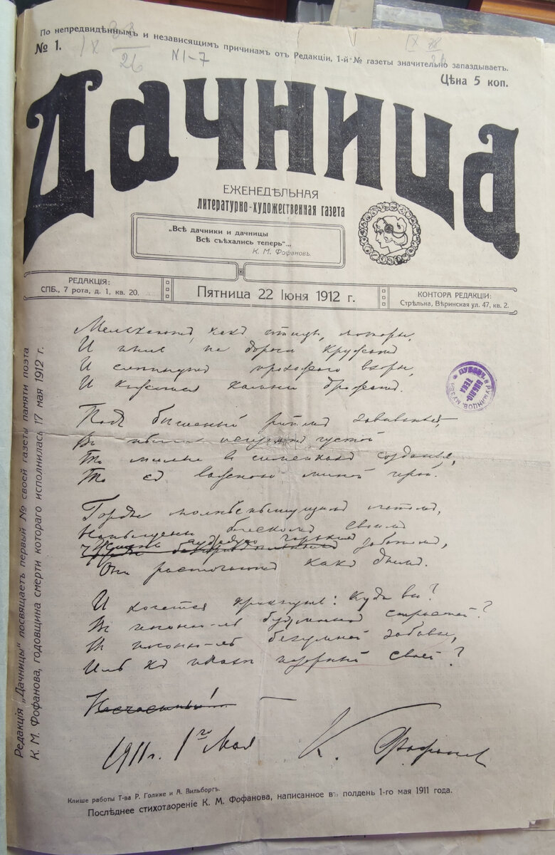 .... Шёл 1912 год. В Стрельне стала выходить газета «Дачница». Событие это свидетельствовало об особом положении, которое Стрельна заняла в ряду других дачных мест. «Дачница» в подробностях пишет о всех развлечениях, существовавших в Стрельне в то время, помещает рекламы стрельнинских лавок и т. п. Именно из нее мы узнаем о стрельнинских циклодроме, как тогда называли велодром, и скетинг-ринге, о знаменитейшей стрельнинской пожарной дружине князя Львова, об одном из первых в России яхт-клубе, организованном в Стрельне. О питерских дачных местах я писала раньше, а сейчас хочу поведать, насколько непросто было пробиться в писатели в прошлом веке. В редакцию газеты присылали рукописи на рецензию: Некоторые отзывы публиковали тут же, в газете. Короткие, как выстрелы и, в основном, очень обидные. Почитайте сами: Как вам? Представляю, сколько колкостей получили бы некоторые из наших дзеновских со-товарищей! (и я в первую очередь) . Понятно, что в Стрельне бывали и жили велики