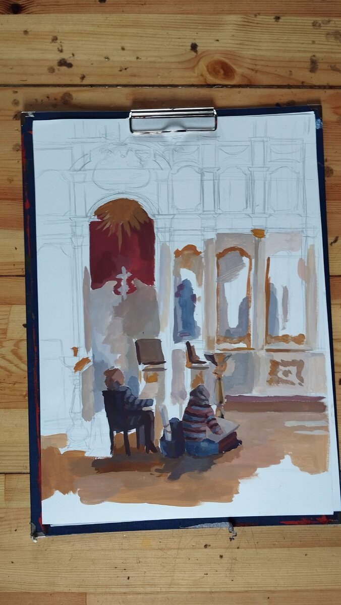 Иногда происходят такие моменты, когда нужно быстро сориентироваться во времени и пространстве! Вот и в этот раз ремонтная обстановка в здании колледжа и невозможность заниматься живописью в аудитории, сориентировали меня на выполнение студентами конкурсной работы. Конкурс "Храмовое зодчество" по положению предполагает пленэрную работу, но погодные условия тоже в данном случае сыграли свою роль. Хоть уже и апрель, но на улице выпал снег и -10! Я договорилась с отцом Дионисием порисовать интерьер Воскресенской церкви. Опыт очень интересный. И осваивание студентами навыка работы в быстрой смене условий! 4академических часа позволили нам достаточно продвинуться в работе, но не успели завершить. Напросилась ещё раз сходить! Церковь готовят к праздникам, её умывают. Мы в этом пространстве бОльшую часть времени были одни! В чём была сложность? Как ни странно выбор вида, ракурса. Почему? Очень много того, что ты видишь не каждый день. И из этого множества нужно выбрать то, что ты успеешь сде