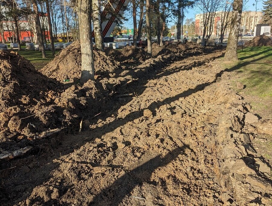 Речь идет о парке 30-летия Победы в Дзержинском районе, где 1 апреля стартовали работы по комплексному благоустройству общественной территории. Ведутся они по нацпроекту «Жилье и городская среда» федерального проекта «Формирование комфортной городской среды». Подрядчик – ООО «Ярдорремстрой» – планирует закончить благоустройство до 31 августа, а стоимость контракта составила 64,6 миллионов рублей. Планов, как говорится, громадье. Это и пирс, и замена плитки, и установка малых архитектурных форм и светильников. Вот только техника выполнения работ, по мнению местных жителей, странная. «Благоустройство» в брагинском парке продолжается. Видимо решив, что деревьев слишком много, а дорожек мало, раскопали траншею прямо по деревьям, пообрубав им корни и заботливо сложив их рядом», «Какой кошмар (теперь красивейшие молоденькие сосны погибнут так же, как вязы и липы на противоположной стороне парка после прошлого "благоустройства". И вместо парка красивого нашего останется плиточно-бетонная ерун