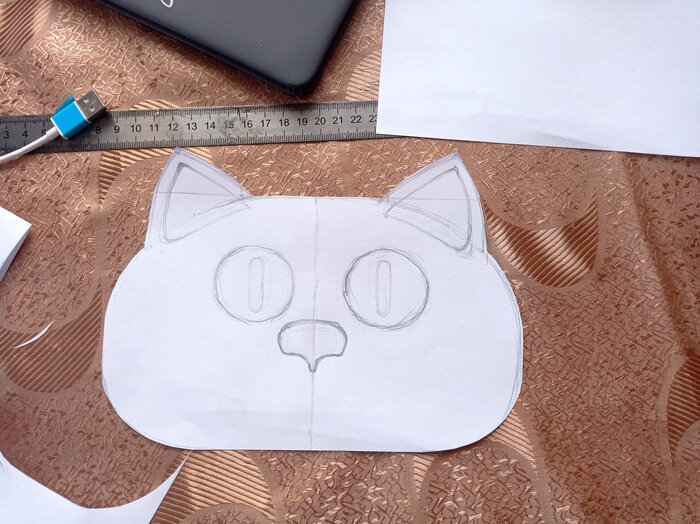 Дочка, гуляя или ходя в гости к подружке, часто носит телефон в руках, что способствует его падению и выходу из строя. Было принято решение сделать ей сумочку для телефона. Учёл пожелания дочери - сумку хотелось бы в виде кошки, с цепью ремешком, и чтобы туда могло помещаться немного конфеток, а лучше одна небольшая шоколадка.)) После изучения интернета пришёл к такому вот изображению лицевой стороны сумки. Глазки сделал из толстой кожи 5мм. Использовал толщину кожи и сделал глазки выпуклыми. Вот тут я как раз обрезаю кошке глазки по краям.))) Бррр.. Жутко звучит. Глазки получились такими ровными, потому что долго их обтачивал на наждачной бумаге. Все элементы из кожи обтачивал наждачной бумагой для придания им гладких линий. Перед пробивкой и пришивкой каждый элемент приклеиваю к основе. Сидишь такой и равномерно тук-скрип-тук-скрип...) Носик, аналогично глазкам, тоже сделал объёмным. Чтобы кошечке было приятнее делать пальчиком по выпуклому носику - Бииип!)) Боковину сумочки сделал о