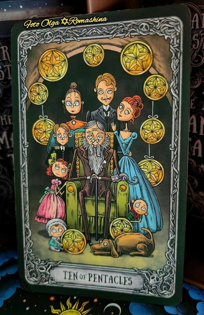Сбывается предсказание, описанное шаг назад Девяткой Пентаклей. Вы заняли прочное положение и в семье, и в бизнесе; то, ради чего вы работали, в ваших руках. Карта Таро десять Пентакли описывает засл