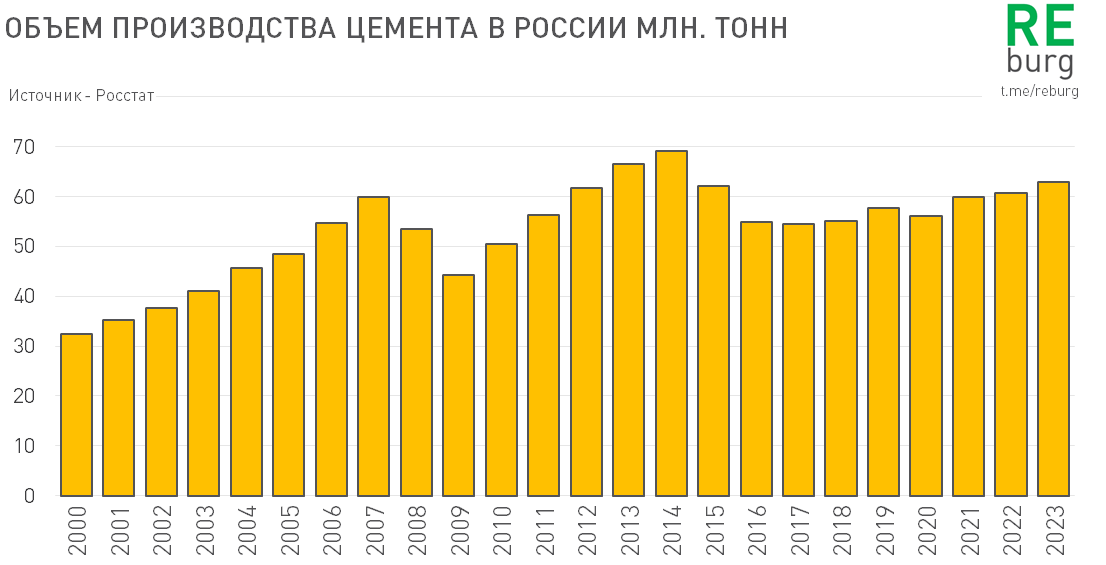 По данным Росстата в 2023 году было произведено 62,9 млн. тонн цемента. Это на 3,1% больше 2022 года.