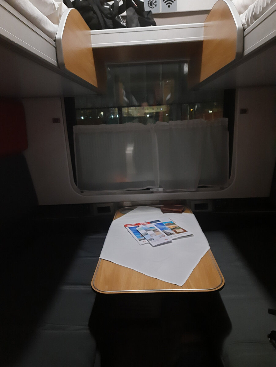 Вчера поздно вечером мы выехали из Перми в сторону Новороссийска. Пермь проводила нас дождём и снегом! Да, вот такая погода бывает на Урале в конце апреля:). Билеты у нас были куплены в купейный вагон повышенной комфортности. Какие же преимущества обещает РЖД за разницу почти в тысячу рублей по сравнению с обычным купейным вагоном? 1) Санитарный дорожный набор. Когда мы зашли в купе, то на каждом месте лежали эти наборы, состоящие из тапочек, рожка для обуви, влажной салфетки и зубной пасты и щётки. 2) Предоставляется пресса. В купе на столике лежало два журнала за апрель 2024 года и рекламный проспект о туристических маршрутах РЖД. Так же, эти журналы и проспекты можно найти на стендах в вагоне. 3) Питание. Как выяснилось, за 2 дня в пути нас покормят только 1 раз. Подписчики мне подсказали, где на билете найти нужную информацию по питанию. Если в билете стоит У1, это значит, что покормят 1 раз, если У2, то 2 раза и т.д. В наших билетах было У1. Проводница нам сразу объяснила