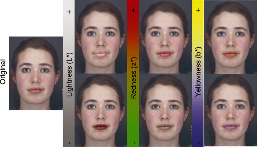 Интересно отметить, что выраженный цветовой контраст между чертами лица, такими как глаза, брови, относительно окружающей кожи, положительно действуют на взор смотрящего как в случае женщин, так и в случае мужчин. А вот более выраженный цвет губ повышает привлекательность только у женщин. У