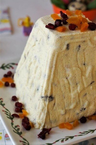 Такую пасху готовят чаще всего - ведь рецепт приготовления пасхи из творога с изюмом не доставит особых хлопот даже начинающему кулинару. Для приготовления традиционной творожной пасхи необходима специальная форма в виде усеченной пирамиды, которая называется пасочницей. Ингредиенты: 1кг. творога 5 шт. яиц 2 стакана сливок 30% 250 гр. сахарной пудры 250 гр. сливочного масла 1-2 щепотки ванилина 1 стакан изюма Шаг 1. Творог тщательно перетираем через сито (это лучше для однородной массы) или можно воспользоваться блендером. Шаг 2. Отделяем желтки от белков. Взбиваем желтки венчиком. Шаг 3. Размягчаем сливочное масло в микроволновке или привычным способом. Шаг 4. Подогреваем сливки и, постоянно помешивая, вводим в них сахарную пудру, ванилин, сливочное масло и взбитые желтки. Шаг 5. Соединяем сливочно-сахарно-яичную смесь с перетертым творогом. Шаг 6. Изюм обдаем кипятком, промываем, обсушиваем и вводим его в творожную массу, тщательно перемешиваем. Шаг 7. Перекладываем твороженную мас