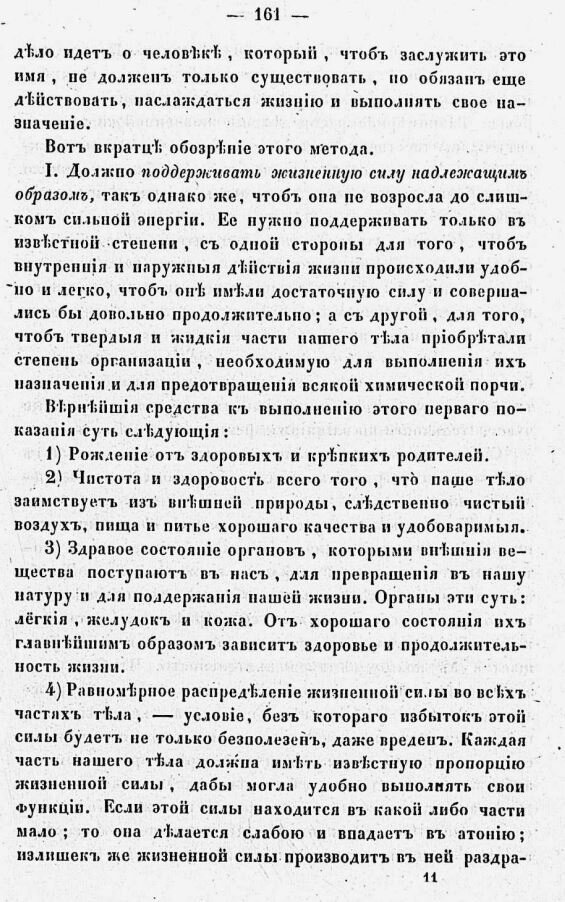 Вот вкратце обозрение этого метода. I. Должно поддерживать жизненную силу надлежащим образом, так однако же, чтобы она не возросла до слишком сильной энергии. Её нужно поддерживать только в известной степени, с одной стороны для того, чтобы внутреннее и наружное действие жизни происходили удобно и легко, чтобы они имели достаточно силу и совершались бы довольно продолжительно; а с другой, для того, чтобы твёрдая и жидкая части нашего тела приобретали степень организации, необходимую для выполнения их назначения и для предотвращения всякой химической порчи. Вернейшие средства к выполнению этого первого показания суть следующие: 1) Рождение от здоровых и крепких родителей. 2) Чистота и здоровость всего того, что наше тело заимствует из внешней природы, следственно чистый воздух, пища и питьё хорошего качества и удобоваримые. 3) Здравое состояние органов, которыми внешние вещества поступают в нас, для превращения в нашу натуру и для поддержания нашей жизни. Органы эти суть: лёгкие, желудо