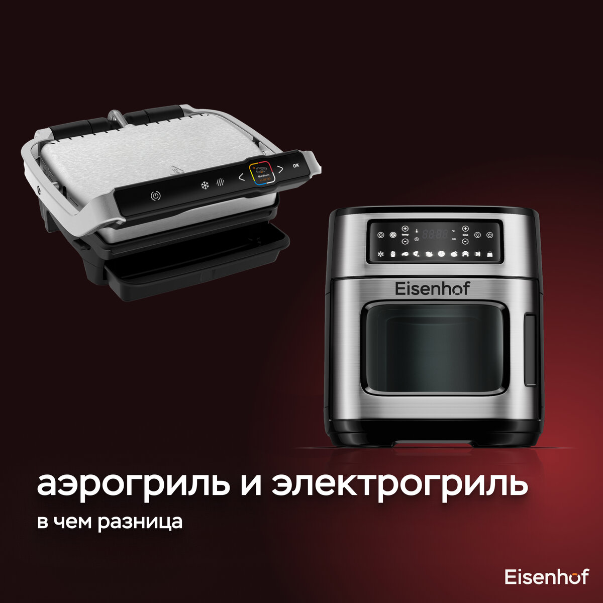 Давайте разберемся, в чем разница между аэро- и электрогрилем. Между этими устройствами отличий гораздо больше, чем между их названиями. Электрогриль Приготовление происходит за счет контакта с горячими ребристыми панелями. Что можно приготовить: стейк, курицу, рыбу, овощи, горячие бутерброды. Плюсы: Минусы: Аэрогриль Приготовление происходит за счет циркуляции горячего воздуха. Что можно приготовить: все то же самое, что в пароварке, микроволновке и духовке. А также высушить фрукты и овощи. Плюсы: Минусы: По возможностям и предназначению это разные приборы. Выбирая, ориентируйтесь на свои цели. Если есть возможность купить оба устройства, то они отлично друг друга дополнят. Аэрогрили Eisenhof подойдут для тушения, запекания, варки, выпечки, жарки и сушки. Одно устройство — десятки рецептов!