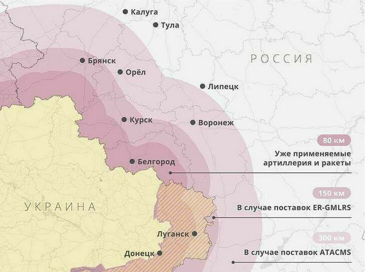 Телеграм-канал «Русское оружие» обозначил радиус действия ракет ATACMS Block I/lA, переданных ВСУ со стороны США. Калужская область попадает в опасную зону. Так, в случае передачи ВСУ ракет ATACMS с модификациями MGM-140B и MGM-164, дальность которых составляет до 300 км, под ударом может оказаться юг Калужской области. Потенциальными целями могут стать Белгород, Курск, Брянск, Воронеж, Краснодар, большая часть территории Крыма, а также Краснодар и сектора Липецкой и Тульской области «Объектово-зональные районы ПВО-ПРО над данными городами и районами должны быть усилены смешанными зенитно-ракетными бригадами на базе С-300В4», – комментирует «Русское оружие».