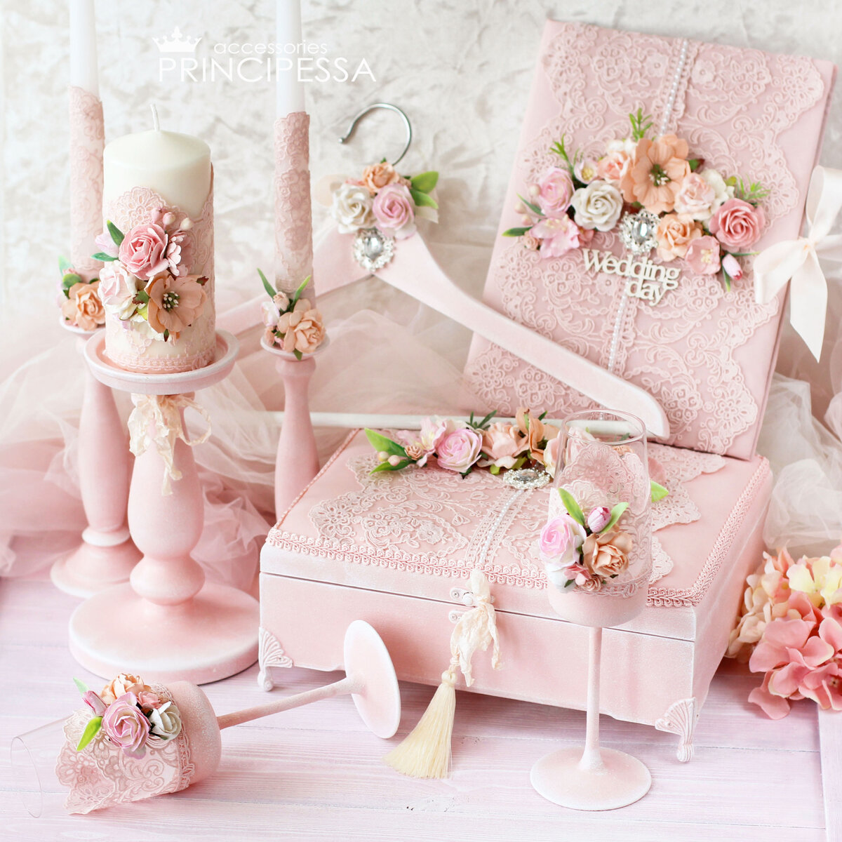 Свадебный набор: -свечи и подсвечники -бокалы свадебные -плечики для свадебного платья -папка для свидетельства о браке -шкатулка для конвертов Набор выполнен на заказ / без повтора Подсвечники грунтованы и окрашены вручную Бокалы окрашены вручную акриловой краской и украшены кружевом и цветами Плечики для свадебного платья деревянные, окрашены вручную Папка для свидетельства о браке обтянута атласным шелком и кружевом На папке декор из бумажных шелковых цветов (Таиланд) Шкатулка для конвертов деревянная Крышка мягкая, также обтянута шелковой тканью и кружевом Внутри шкатулки такая же ткань, в ней после можно хранить украшения ______________________________ Мои другие источники, где я делюсь своим творчеством: Instagram: https://www.instagram.com/solis.iness Ярмарка мастеров: https://www.livemaster.ru/principessa-si Вконтакте: https://vk.com/solis_iness Telegram: https://t.me/solis_iness Pinterest: https://ru.pinterest.com/solis_iness Boosty.to: https://boosty.to/solis.iness You Tube: