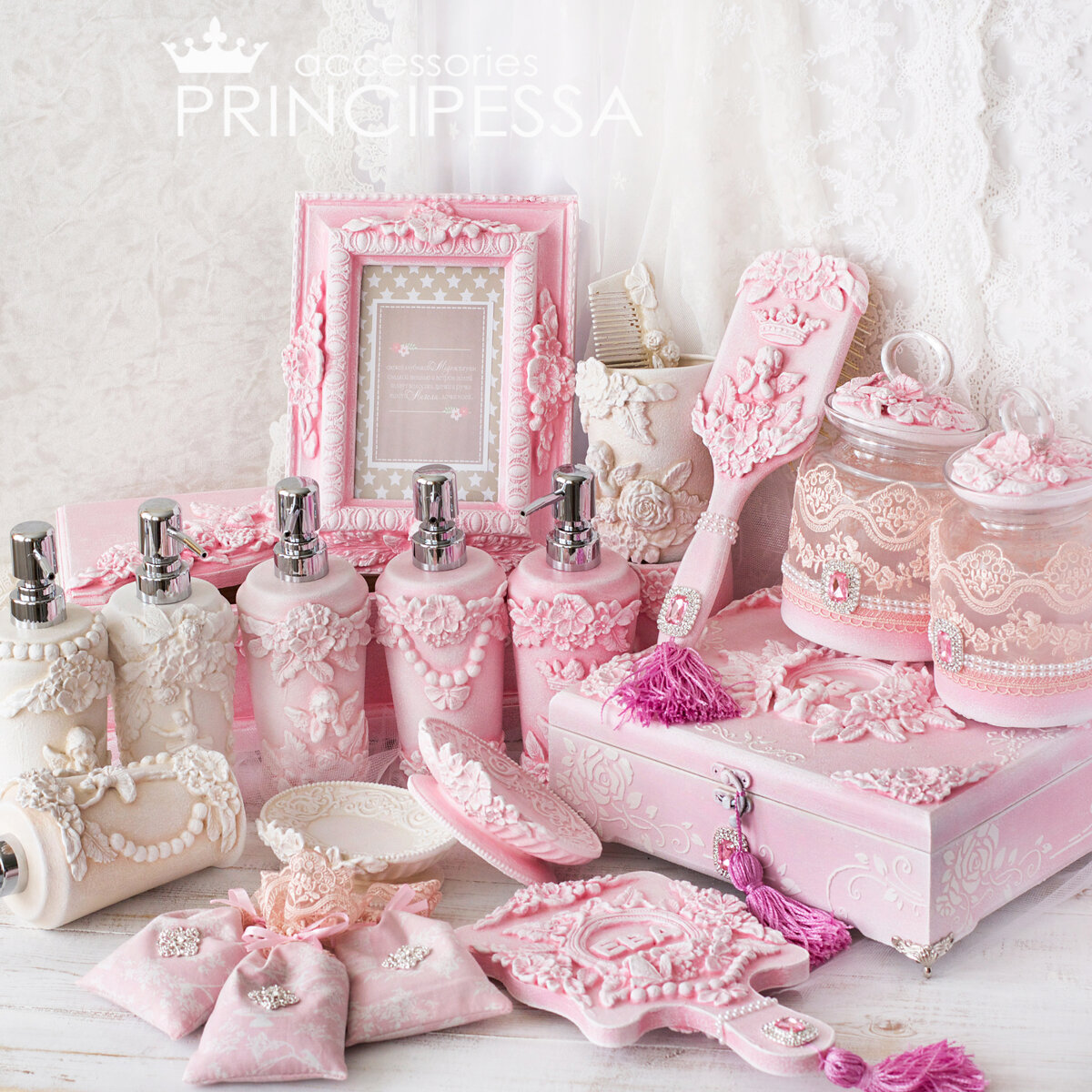 Большой подарочный набор для девочки на день рождения в ее ванную комнату В набор входило: -рамочка для фото -зеркальце и расческа -2 мыльницы -6 дозаторов для мыла / шампуня / геля -мешочки с лавандой (саше) -салфетница -шкатулка для украшений -стакан для щетки -стакан для зубной пасты -2 баночки для ватных дисков и палочек -расческа деревянная с зубчиками Дозаторы для геля / шампуня / мыла и тд Выполнены с градиентом, грунтованы и окрашены вручную акриловыми красками Декор выполнен из лепнины глиной с помощью молдов Мыльницы окрашены вручную покрыты лаком Стаканы для щеток и пасты декорированы в той же технике Стеклянные баночки для ватных дисков и тд Крышки баночек декорированы в общем стиле с лепниной Весь лепной декор полностью ручная работа и каждый элемент сделан вручную Саше с лавандой в хлопковых мешочках Зеркальце и расческа деревянные окрашены вручную Салфетница деревянная с лепным декором на крышке, дно обтянуто хлопком Шкатулка для украшений деревянная на металических нож