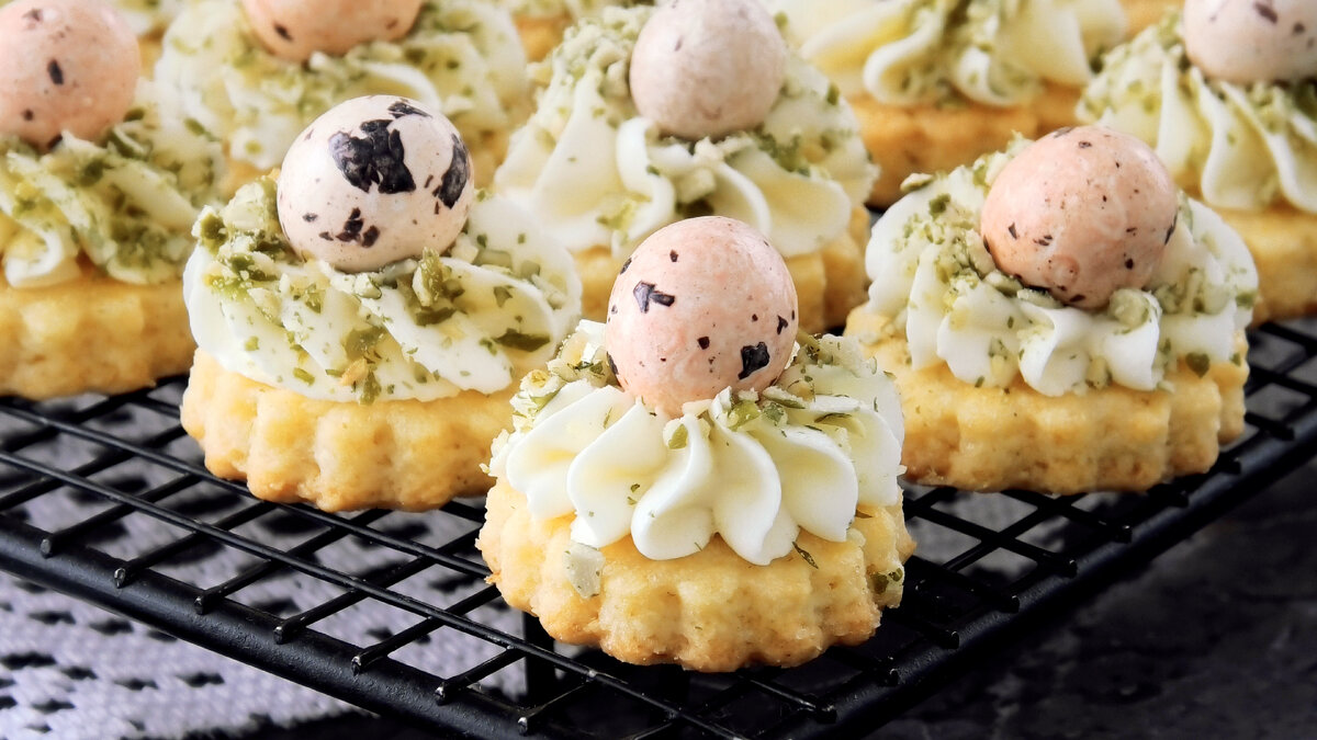 Всем привет! На праздничный пасхальный стол я предлагаю приготовить вот такое чудесное печенье. Оно отлично дополнит сладкий стол, украсит своим необычным и интересным видом и порадует всех своим вкусом. Это печенье состоит из песочной основы с лёгким лимонно-ванильным ароматом, шапочки из нежного сливочного крема, украшено молотыми семенами тыквы и драже в виде пасхального яйца. У меня скопилась целая коллекция разного пасхального печенья, все они очень интересные и необычные. И этот рецепт не стал исключением! Оно мне очень понравилось, и я от души делюсь с вами рецептом! 📝Ингредиенты *Тесто* -250 гр пшеничной муки в/с -125 гр холодного сливочного масла -70 гр сахара -1 яйцо -8 гр ванильного сахара -1 ч.л разрыхлителя -цедра с одного лимона -щепотка соли *Крем* -160 мл жирных сливок 33% -200 гр сливочного творожного сыра -3-4 стол.л сахарной пудры -8 гр ванильного сахара *Дополнительно* -70 гр молотых тыквенных семечек или фисташек -200 гр драже