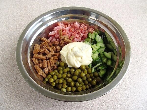 САЛАТ С СУХАРИКАМИ И КОПЧЁНОЙ КОЛБАСОЙ ИНГРЕДИЕНТЫ ✅️Колбаса копчёная – 150 граммов; ✅️Сухарики с чесноком – 50 граммов; ✅️Консервированный зелёный горошек – 3–4 ст. ложки; ✅️Огурец свежий – 1 шт; ✅️Майонез – 2 ст. ложки; ✅️Соль – по вкусу. ПРИГОТОВЛЕНИЕ: Этот салат может быть как обыденным, так и праздничным. Подать его лучше порционно, украсив по своему усмотрению. Сухарики могут быть любыми, но лучше всего подходят с чесноком. Подают салат без промедления, чтобы сухарики не размокли. Для приготовления салата нужно взять копчёную колбасу, сухарики к пиву с чесноком (можно другие), консервированный зелёный горошек, свежий огурец, майонез и соль. Колбасу очистить от оболочки и нарезать мелкими кубиками. Если сухарики слишком длинные, то нужно их поломать на части. Огурец вымыть, разрезать вдоль на четыре части и тонко нарезать поперёк. Соединить колбасу, сухарики, горошек и огурец. Ингредиенты заправить майонезом и, при необходимости, посолить. Салат перемешать. Подать сала