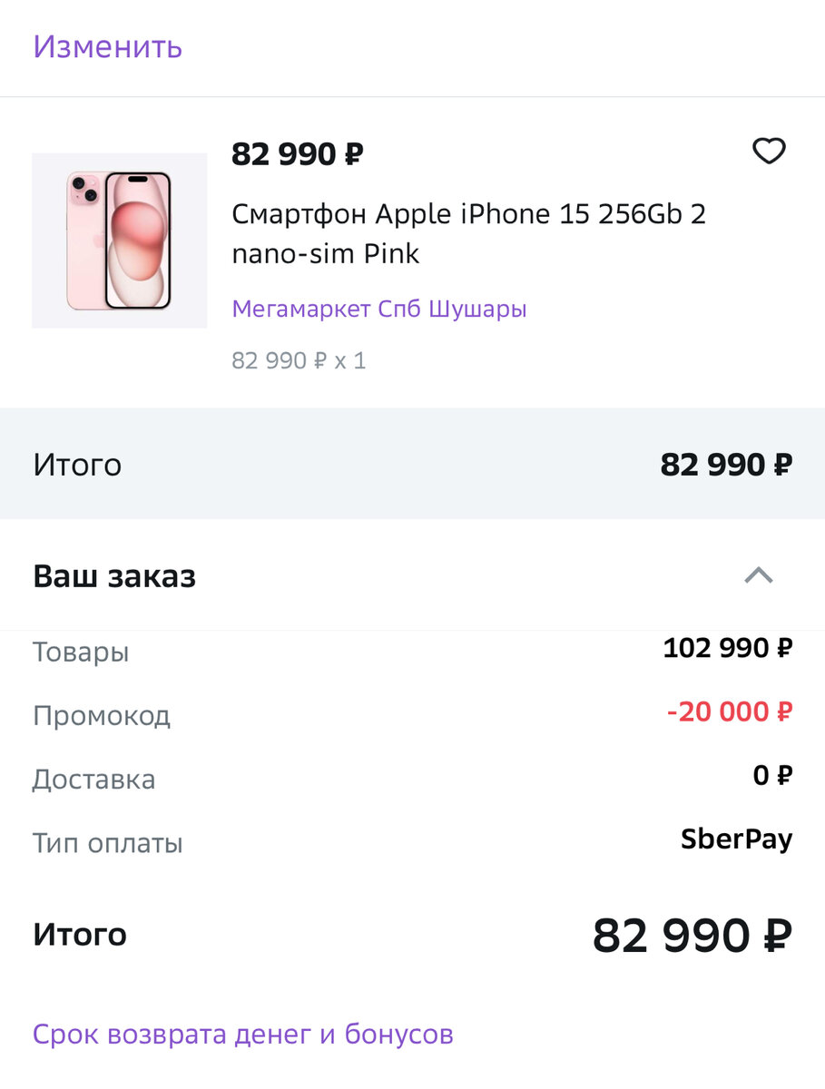Так я разошлась с продажами на Авито да заработком на Дзен-канале, что, наконец, смогла обновить свой старенький IPhone XS Max (пятый год «парню») на желанный IPhone 15! Надеюсь, долю сарказма вы поняли! Итак, несколько дней я сверяла цены на разных маркетплейсах в поисках выгоды для себя. Сначала мне показалось, что дешевле всех телефон на Яндекс маркет,- там цена прыгала от 82000 до 85000₽. Но уже перед самой покупкой обнаружила, что на МегаМаркет с промокодом (пришел в личный кабинет)- покупка выгоднее: промокод минус 20000₽! Но не обольщаемся, цена упала до уровня Яндекс маркет и стала 83000. Но есть неоспоримое преимущество- за покупку телефона на ММ начисляют почти 10000 сберспасибо (а ими, как мы помним, можно оплатить до 99% от стоимости товара/заказа в разных магазинах). Такая простая математика! Заказ я оформила 24 апреля, а уже 26 апреля мне доставили мой «ценный груз»! Выбор пал на Apple IPhone 15 256 гб. Pink. Розовый, как зефирка, как сахарная вата! Прелесть! А мой дес