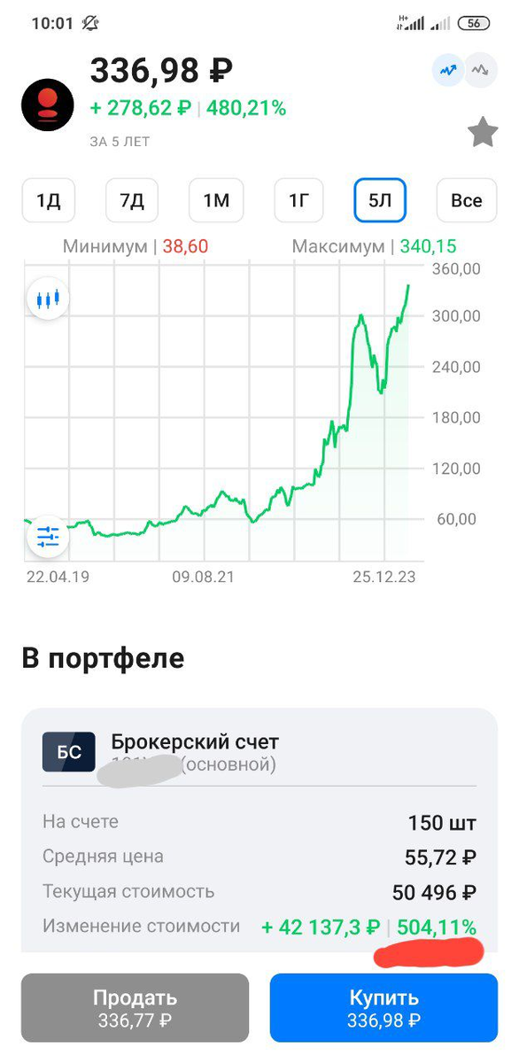 +500% прибыли - первая бумага в портфеле, которая преодолела эту планку - Банк Санкт-Петербург.
