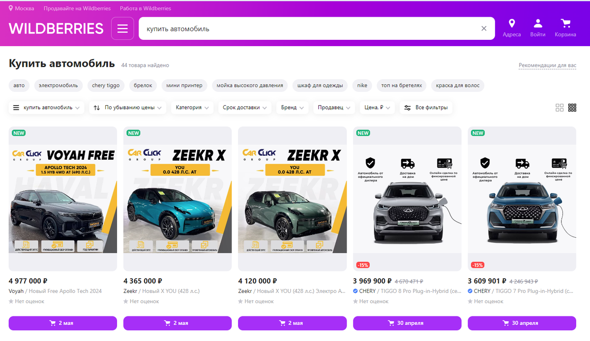 Статья не является рекламой и носит исключительно информационный характер. Wildberries теперь не какая-то барахолка, а онлайн-ретейлер. С 18 апреля 2024 в продаже появились автомобили-китайцы. На сайте маркетплейса уже доступны Chery, OMODA, JAECOO, Zeekr. Я проверила. По запросу "купить автомобиль" нашлось 43 товара подобного типа. Цены от 1,8 до 5 млн руб. Если сегодня (25 апреля) внести 100-% предоплату, уже 30 апреля - 2 мая (как обещают на сайте) автомобиль подгонят прямо к подъезду (или в другое, указанное покупателем, место). Для оплаты подойдёт карта, привязанная в личном кабинете. Получив её, продавец позвонит и запросит данные, чтобы оформить ЭПТС. В назначенные время и место машину доставят вместе с документами (договор, акт приёма-передачи, ЭПТС). После этого останется лишь зарегистрировать авто в ГИБДД. Кстати, о компенсации за использование личного автомобиля на работе, читайте тут. Воспользоваться “заманчивым” предложением смогут пока не все - лишь жители некоторых регио