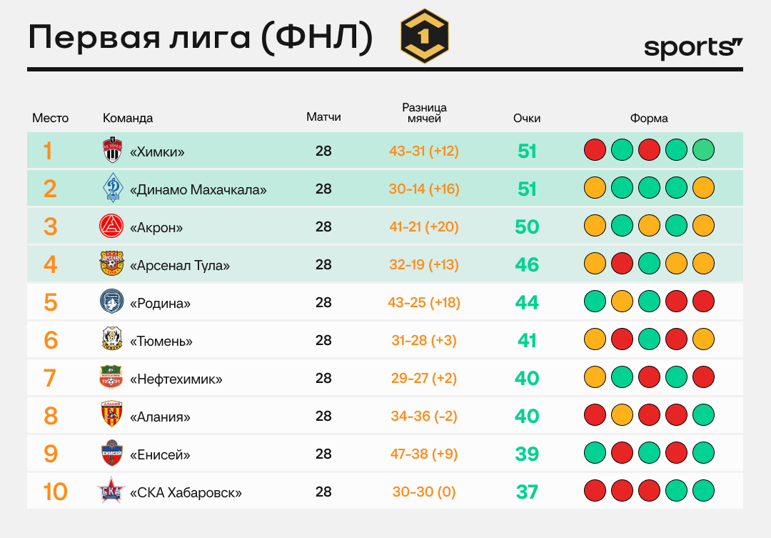 Яркая развязка сезона в Мелбет Первой лиге: на прямой выход в РПЛ претендуют аж четверо, отрыв первого места от пятого – всего семь очков. Ситуация за шесть туров до финиша. «Химки» на первом месте, потому что выиграли 1:0 в очном матче с махачкалинским «Динамо», но через два тура встречаются снова, расклады могут измениться. Совсем рядом «Акрон» и тульский «Арсенал». Борьба за прямой выход: «Химки» и «Динамо», «Акрон» и «Арсенал» Возможно, к гонке подключится «Родина», но пока кандидата четыре. ● «Химки» – один из фаворитов. Команда Андрея Талалаева идет не очень ровно, зато выиграла два последних матчах против КАМАЗа и «Родины». Весь сезон «Химки» хорошо играют с конкурентами и отдают очки аутсайдерам. Но цель остается одной: «Перед командой стоит задача напрямую выйти в РПЛ. Никто не снимал, ее надо выполнять», – озвучил главный инвестор Туфан Садыгов. Один из главных героев – хавбек Хетаг Хосонов. Похоже, нашел себя после ЦСКА: сначала выживал с «Тамбовом», потом помогал «Алании»,