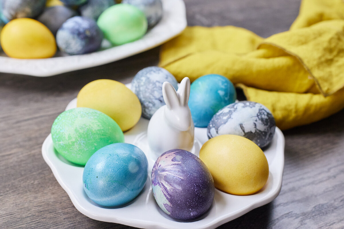 Ингредиенты Яйца белые 20 шт. Капуста краснокочанная (синий цвет) 450 г Куркума (жёлтый цвет) 25 г Чай «Каркаде» (пятнистые) 50 г Петрушка (зелёный цвет) 50 г Столовый укус 9% 1 ст. ложка Подсолнечное масло 20 мл Понадобятся наклейки для декора яиц с чёткими очертаниями Приготовление 1. Заранее отварить вкрутую и остудить яйца. 2. Подготовить 4 миски для натуральных красителей. 3. Краснокочанную капусту мелко нарезать, отправить в кастрюлю и залить 1 л воды. Поставить на огонь и варить около 15 минут до насыщенного цвета. Дать немного остыть и перелить в первую миску. 4. Во вторую миску отправить каркаде и залить 700 мл горячей воды. 5. В третью миску отправить куркуму и залить 700 мл горячей воды. 6. В куттере перебить до однородности петрушку с водой 500 мл, добавить 1 ст. ложку уксуса и перемешать. 7. На половину яиц плотно приклеить декоративные наклейки с чёткими очертаниями. 8. Отправить яйца с наклейками и без наклеек в красители (по 5-6 яиц) хорошенько их потопив, чтобы к