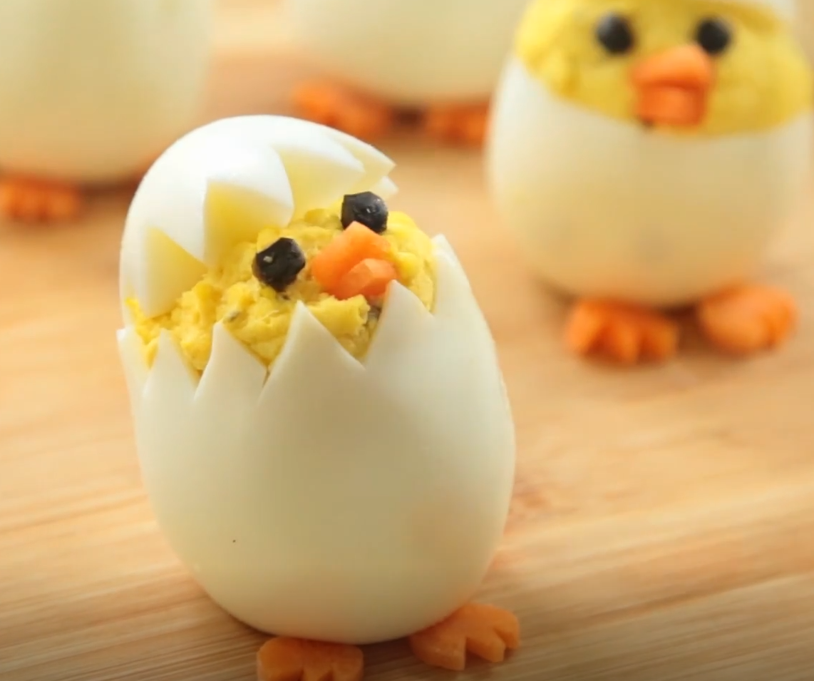 ✔ Нарежьте кусочки оливок небольшими квадратиками. Добавьте по 2 глаза каждому цыпленку. Поместите верхушки яиц на каждого цыпленка.