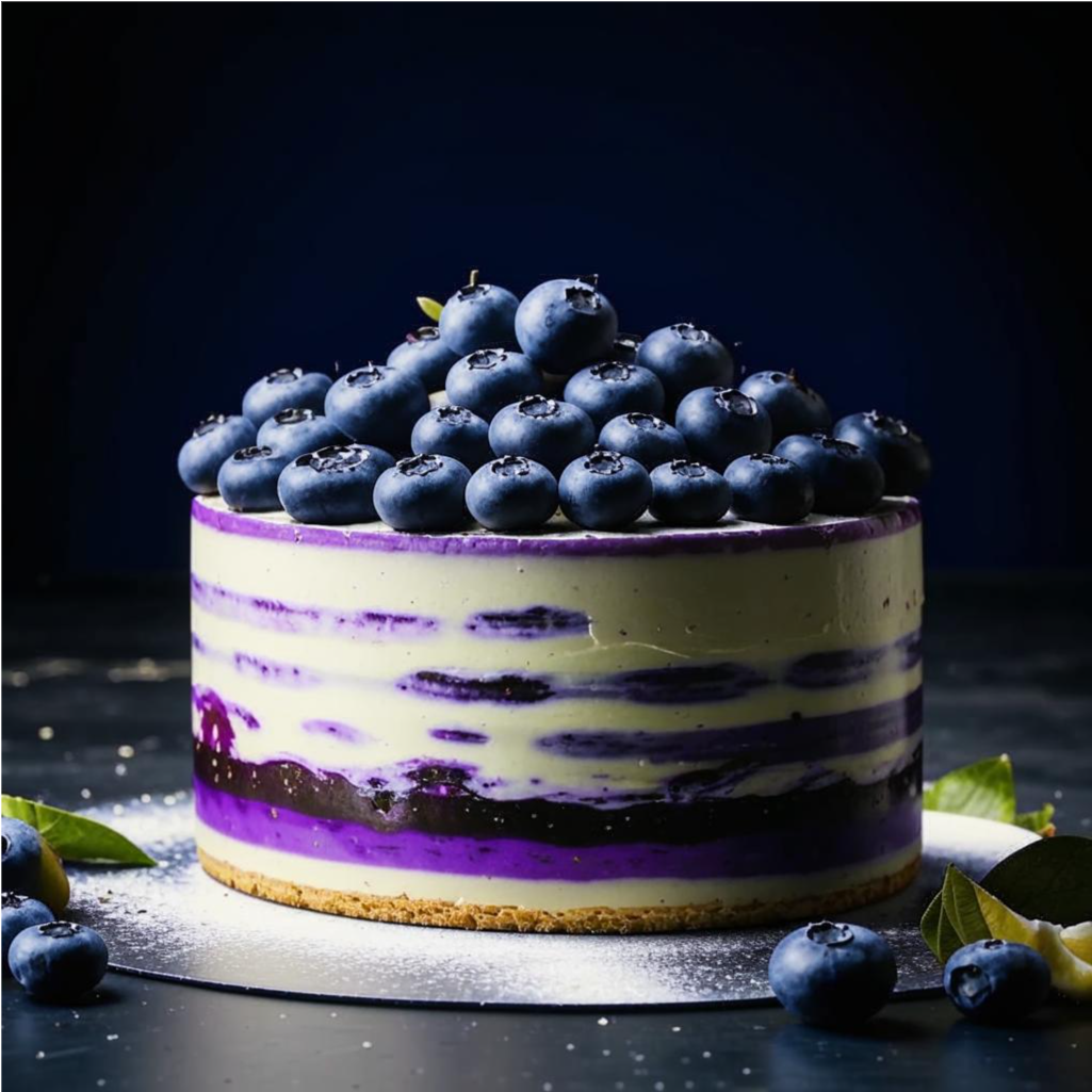 1. **Ягодный вкус:** Черничный мусс придает торту интенсивный и сочный ягодный вкус, который отлично сочетается с лимонным ароматом и кислинкой.