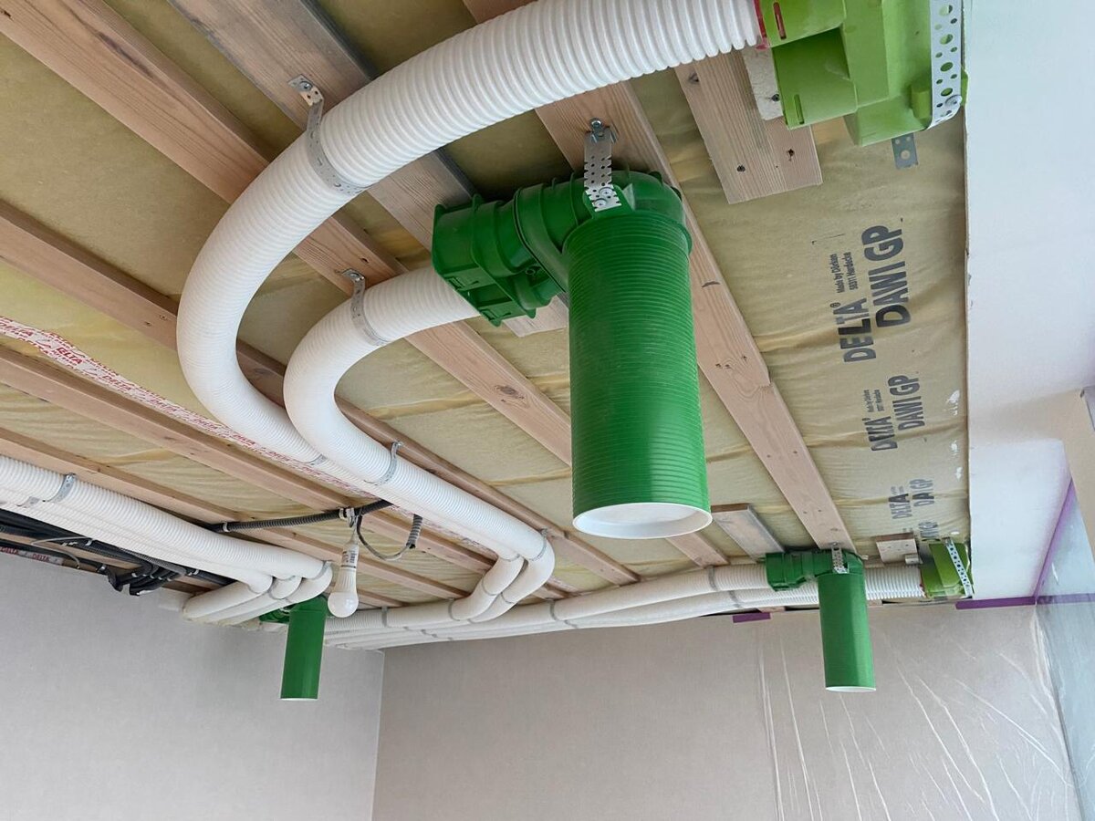 Это как? По потолку первого этажа фахверка проложены воздуховоды Blizzard Alpina для подачи приточного воздуха в спальню на первом этаже - адаптеры диффузоров и для подачи приточного воздуха в спальню на втором этаже - адаптеры напольных решеток, воздуховоды к котором подведены тут-же, под потолком первого этажа. Монтаж и пуско-наладка оборудование Блиццард Люфттехник на объекте: компания 100ВЕНТ