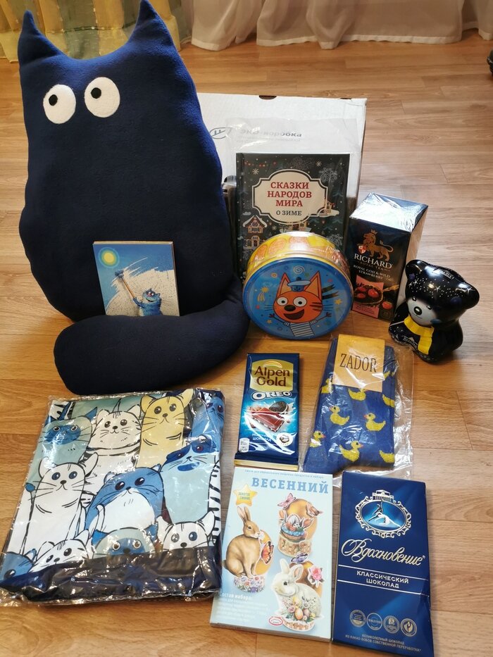 В этот раз я как никогда затянула с отправкой уже собранного подарка - такое было впервые по этим самым семейным и рабочим обстоятельствам, банально не было времени: (Но в итоге удалось выкроить денёк и с помощью волшебницы Галины подарочек улетел к моему получателю на СДЭКовских "почтовых голубях". Захожу, значит, на сайт АДМ, чтобы подтвердить отправку, и вижу, что мне тоже отправили подарочек! И в пути он будет целых.. Один день. Вот так сюрприз! Так что на следующий день я уже занималась волнительной распаковкой. Вот что мне прислала моя волшебная фея Виктория. И я реально не могу передать словами, насколько мне всё понравилось!!! Плюшевый котик-подушка, набор открыток со знаменитыми в посткроссерских кругах Синими Котами, ни разу ещё не видела эти сюжеты! Книга сказок народов мира про зиму - уууу, как же я обожаю сказки, мне их ещё ни разу не дарили на АДМ, я "ф щасте"!!! Два вида чая - Мишутка уже опробован с шоколадками, вкусняшки. Носки с утками, круууть! Пасхальный набор для д