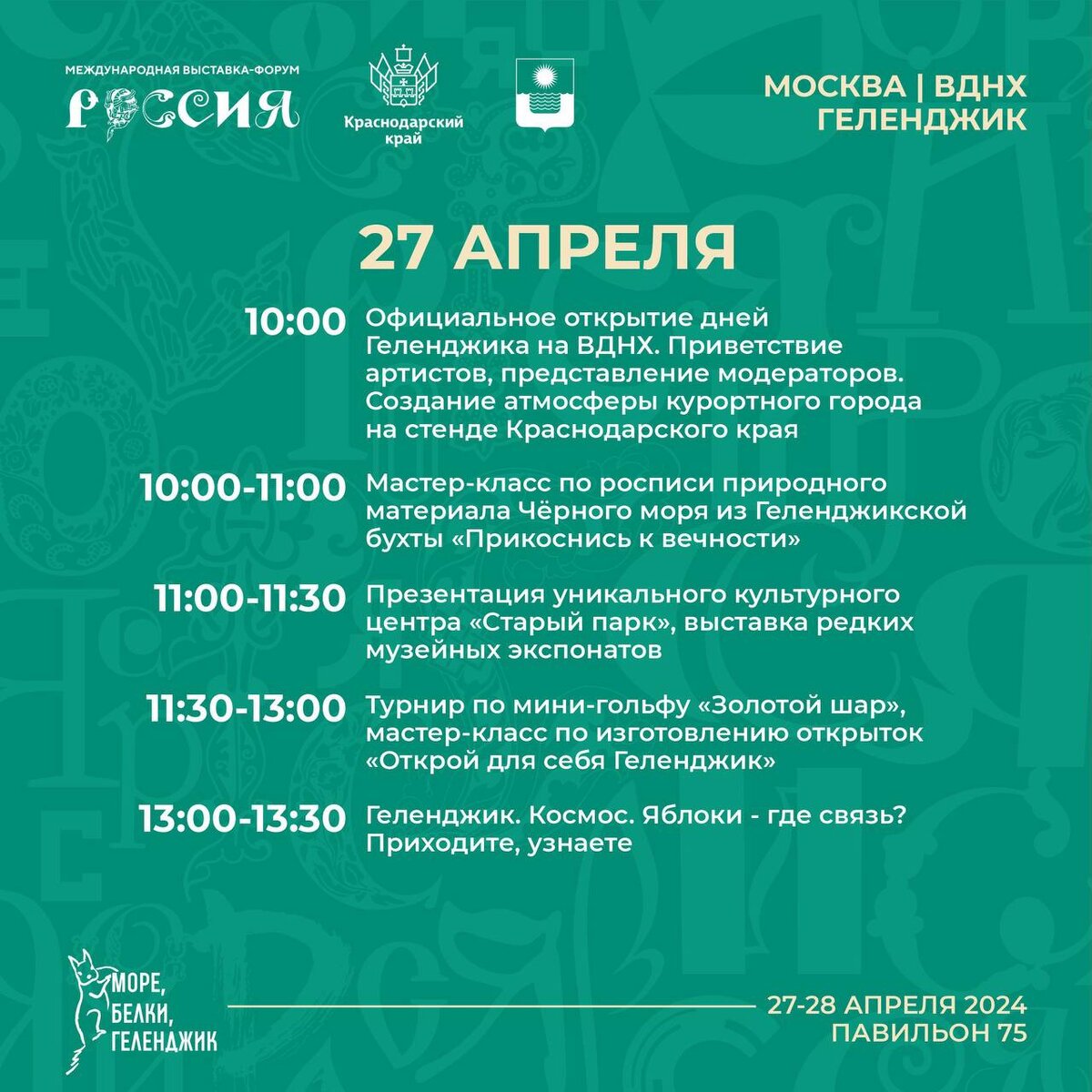 В рамках Международной выставки-форума «Россия» на ВДНХ с 27 по 28 апреля на стенде Краснодарского края пройдут дни Геленджика под эгидой «Открой для себя Геленджик». На стенде региона наш курорт покажет все, чем славен он для местных жителей и интересен для гостей. В программе выставки: - интересные факты об истории курорта; - розыгрыш путевок для незабываемого путешествия в Геленджик; - мастер-классы и еще масса разнообразных активностей. Ждем вас в павильоне N75 на ВДНХ в ближайшие выходные. Проведите их с Геленджиком - интересно и полезно! Все подробности в афише. Справочно: Международная выставка-форум «Россия» — это важнейшие достижения страны, собранные на одной площадке. В течение всего времени проведения Выставки гостей ждут культурные мероприятия, насыщенная деловая и образовательная программа. Посетителям представлены экспозиции 89 регионов России, ведущих федеральных ведомств, корпораций и общественных организаций. Выставку уже посетило более 10 млн человек. Междунар