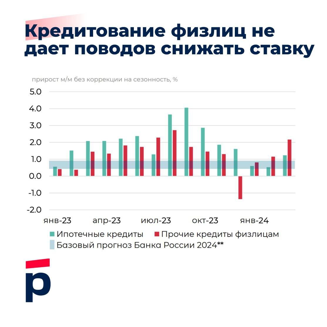 Согласно отчету Банка России, кредитование в марте продолжило ускоренный рост во всех сегментах, несмотря на жесткие денежно-кредитные условия. Ускоренный прирост корпоративного портфеля (+1.8% м/м) регулятор связывает с потребностями по уплате налогов (НДД, НДС, налог на прибыль за четвертый квартал 2023 года). Спрос на рублевые кредиты мог появиться из-за проблем с расчетами за ВЭД и отложенным поступлением валютной выручки. Ипотечный портфель прибавил 1.2% м/м против 0.5% м/м в феврале. Практически полностью рост был обеспечен ипотекой с господдержкой. Вероятно, опережающий спрос на ипотеку будет сохраняться до середины года из-за опасений граждан по изменению параметров и лимитов по программам. Прирост потребительского кредитования ускорился с 0.9% м/м в январе-феврале до 2% м/м в марте, отражая высокий потребительский спрос и уверенность в доходах. При этом доходов граждан хватает как для роста кредитов, так и для наращивания депозитов и текущих счетов (+1.9% м/м в марте)