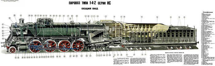 Было дело - повозился я с не очень качественным фото советского плаката с устройством паровоза ИС. В общем, вот: Ниже расшифровка текста: Краткое описание устройства паровоза ИС. Паровоз серии ИС снабжён мощной топкой с поверхностью нагрева в 31, 23 кв. м. и колосниковой решёткой 7, 04 кв. м. Отличительной особенностью топки, является цилиндрическая форма верхней её части (радиальная топка) и наличие камеры догорания, служащей для догорания газа. Кипятильные трубы, установленные в топке, служат для циркуляции воды в котле и для поддержания свода. Цилиндрическая часть котла состоит из четырех барабанов. Передние два барабана цилиндрической формы. Третий барабан для перехода от второго к более широкому четвёртому имеет коническую форму; четвёртый барабан имеет цилиндрическую форму, но ввиду наличия в нём камеры догорания диаметр его больше первого и второго барабанов. В цилиндрической части котла помещены жаровые и дымогарные трубы. Число жаровых труб 130, дымогарных — 44. Диаметр труб: