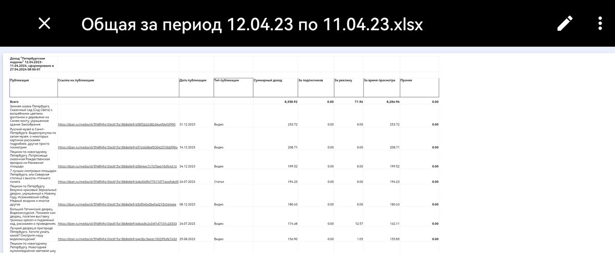Мы уже год на Дзене. Да, так быстро летит время. Канал "Петербургские мадамы" был открыт 12 апреля 2023 года. Конечно, хотелось бы написать историю грандиозного успеха, но мы расскажем вам, как есть на самом деле. За этот год мы, следуя всем советам аборигенов площадки, размещали публикации регулярно, минимум по одной в день. Даже завели рубрики "Субботние тесты" и "100 лет назад". Работали без выходных и праздников. Можем без ложной скромности сказать, что качество нашего контента улучшилось, видео наши интересно не только смотреть, но и слушать. За год на наш канал подписалось 495 человек (сейчас нас уже 520), мы всех видим и безмерно любим. Мы сняли и поделились с вами 234 видео Написали 150 статей (в т.ч.тесты) Выложили 53 ролика Написали 3 поста Не будем вас томить, сумма нашего заработка составила - 8 358,92 (Восемь тысяч триста пятьдесят восемь рублей, 92 копейки.) Монетизацию мы подключили 01 августа 2023 года. Самый доходный день был 29 декабря - 174 рубля 34 копейки Самый п