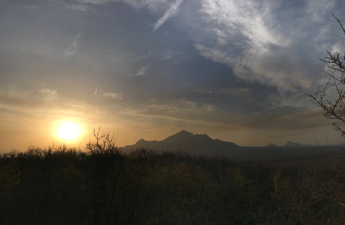 С тропинки стало видно простор. Чем выше, тем просторнее. Воздуха много-много, и весь твой. Бештау – четким силуэтом, хотя, что это, солнце чуть скользнуло, и Бештау распалась на отдельные вершины, амфитеатр вершин. Стало похоже на кратер огромного древнего вулкана. Правее гора Железная, потом Спящий Лев (Развалка), вдалеке Змеиная. Недаром столько фотографий старых с этими самыми видами. Недаром в начале прошлого века здесь, неподалеку, кафешка была. Везёт кавалер даму кататься близь Машука – виды чудо – а не хотите ли, дама, чай с зефиркою, а то и плотнее покушать, приказать форель из бассейна выловить, да зажарить?
