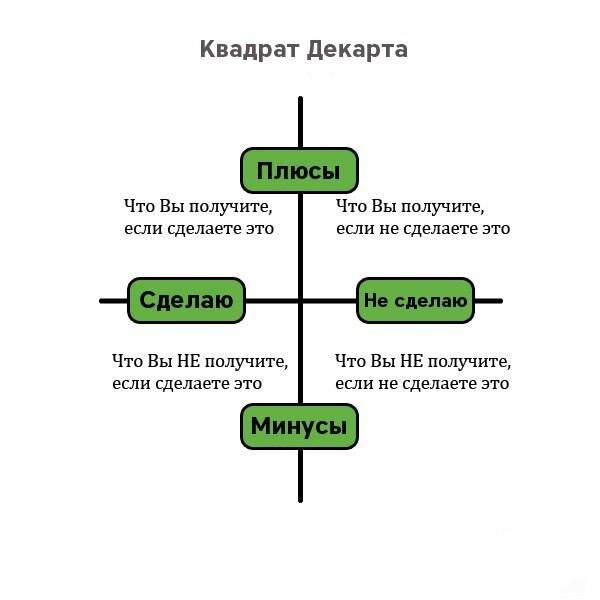 Автор данной методики Рене Декарт (французский философ и математик), возможно вы помните его со школы. Так вот перед принятием решения вам нужно ответить на 4 вопроса: 1️⃣ Что произойдет или что вы получите, если сделаете это. Прописываете все плюсы от наступления события. 2️⃣ Что произойдет или что вы получите, если не сделаете это. Прописываете все плюсы, если событие не наступит. 3️⃣ Чего не произойдет или что вы не получите, если вы сделаете это. Прописываете все минусы от наступления события. 4️⃣ Чего не произойдет или что вы не получите, если вы не сделаете это. Прописываете все минусы, если событие не наступит. Выполнять письменно с листом бумаги и ручкой! Дает понимание того, нужно вам это или нет. Переходите в моей телеграм канал УПРАВЛЕНИЕ ВРЕМЕНЕМ - это ваш карманный онлайн-журнал по психологии.