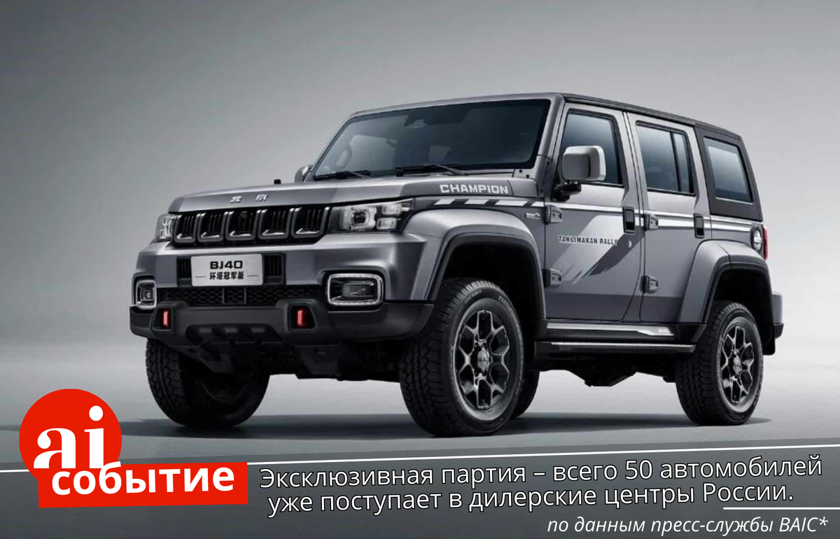 Лимитированная версия рамного внедорожника BAIC BJ40 Champion была выпущена в 2023 году в честь победы в суровом международном ралли «Такла-Макан». Эксклюзивная партия – всего 50 автомобилей уже поступает в дилерские центры России.