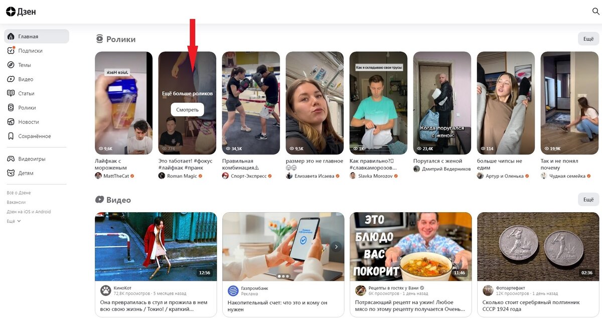 Первое, что нам нужно будет сделать, это конечно же зайти в сам Яндекс Дзен, и найти в нём нужный нам ролик, который мы бы очень хотели скачать. В нашем случае, это будет крайний ВТОРОЙ ролик слева, про «ФОКУС».