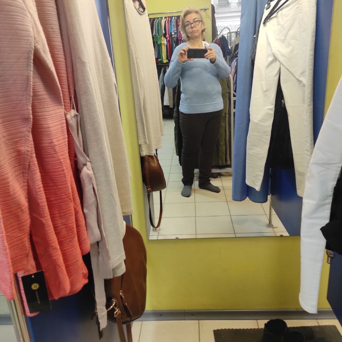 Напомню, что так как у меня не складывается с примерками в обычных магазинах, я пошла по секондам. Вот там я могу хоть часами примерять, что угодно. Никому до меня дела нет. Никто не стоит над душой, не заглядывает в кабинку. Пересчитали вешалки, чтобы я ничего не сперла у них, видимо, и такое бывает, и больше я их не интересую. Так что примеряй - не хочу! Меня устраивает. Такой бред иногда примеряю 😁