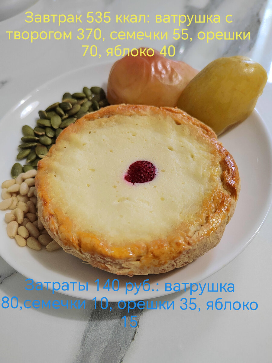 Сегодня на завтрак ватрушка с творогом на творожном тесте. Идея ватрушки, а также использование оригинальных силиконовых формочек для них, позаимствована у Валентины Пейппо. Завтрак: ватрушка, орешки 10 гр, семечки 10 гр, яблоко на пару 100 гр