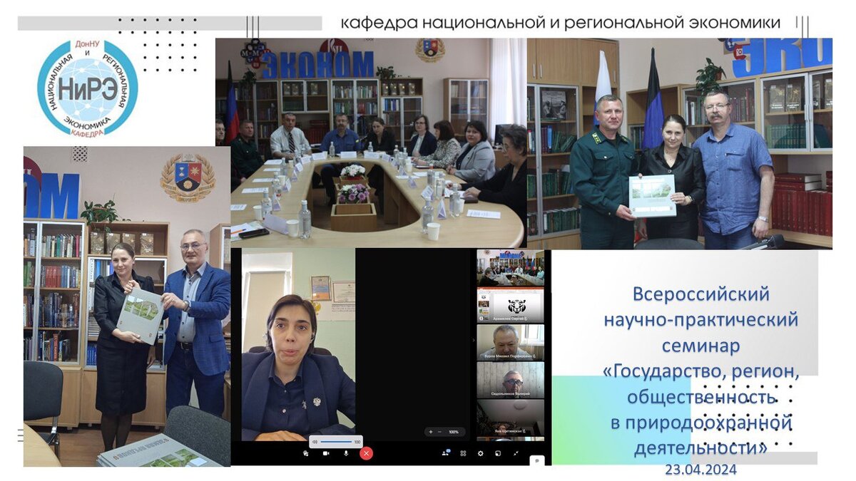 23 апреля по инициативе экономического факультета состоялся Всероссийский научно-практической семинар «Государство, регион, общественность в природоохранной деятельности», который на единой дискуссионной площадке объединил учёных, управленцев и практикующих специалистов в области актуальных проблем природоохранной деятельности. Открыли первый семинар проректор по научной и инновационной деятельности Александр Белый и декан экономического факультета Юлиан Полшков. Председатель ГК по экологической политике и природным ресурсам при Главе Донецкой Народной Республики Роман Кишкань акцентировал внимание на системной работе в области природоохраны в Республике и презентовал участникам семинара иллюстрированное издание «Неизведанный Донбасс. Земля предков». Заведующая кафедрой национальной и региональной экономики Елена Кошелева, которая стала инициативным организатором проекта семинара, обозначила важность перехода к новой экономике, где проблемы природоохраны являются частью единой государс