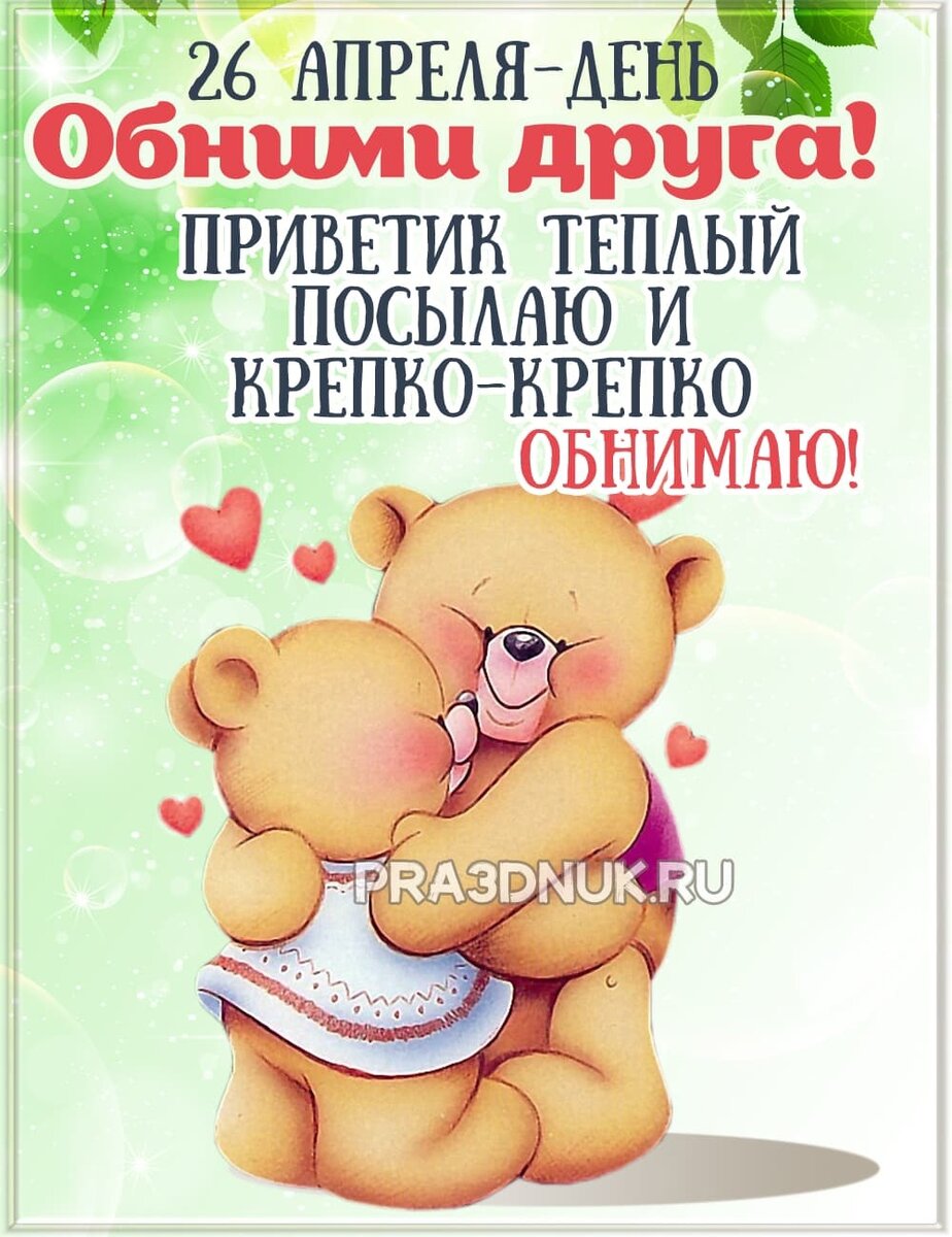 26 апреля - День обними друга🙂🧡🙂🧡🙂🧡🙂В день объятий свою нежностьИ заботу прояви.И того, кто сердцу дорог,Крепко-крепко обними.Пусть согреет в мире сером,В миг холодных, дерзких вьюг,Доброе прикосновениеЛасковых, любимых рук.