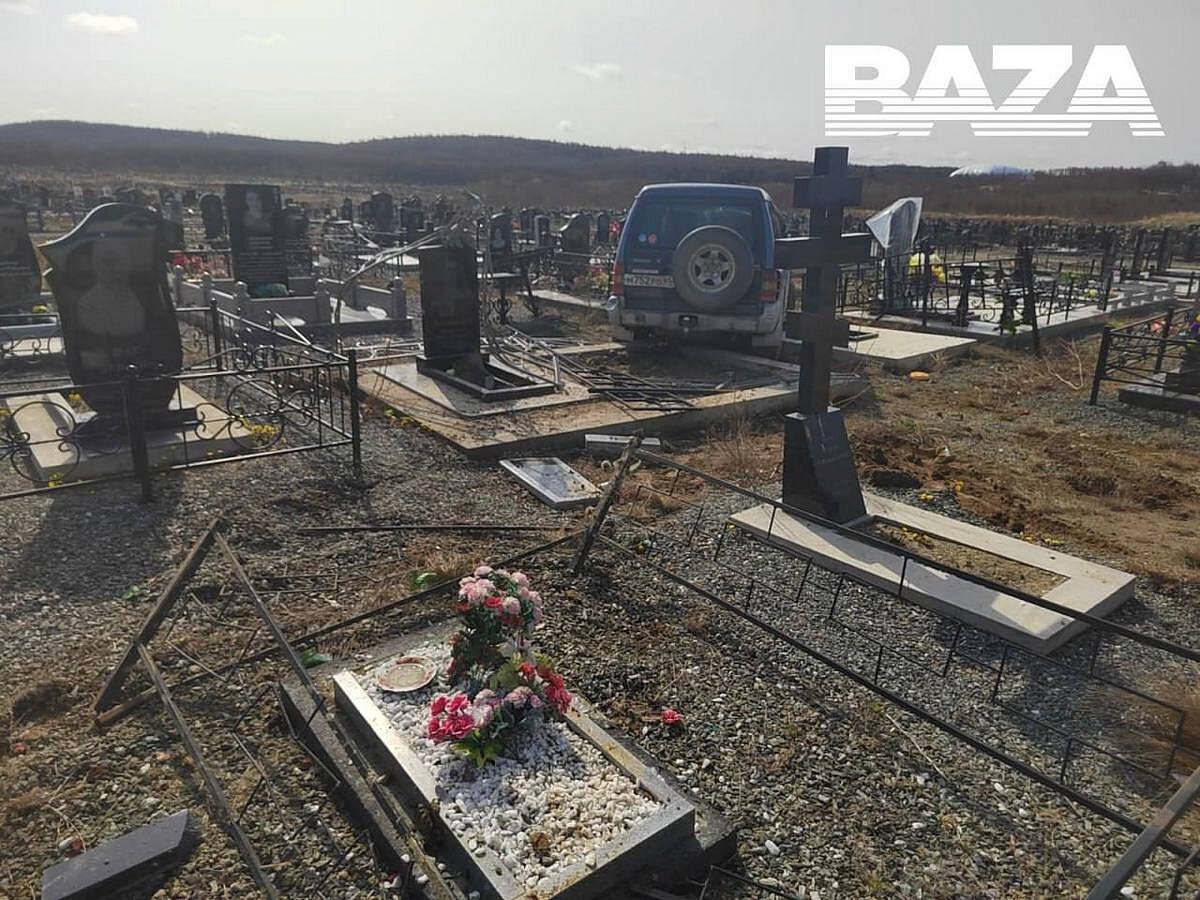В российском регионе автомобиль влетел на кладбище Утро на кладбище в Южно-Сахалинске началось со странного перформанса: внедорожник, въехавший на территорию захоронения снёс несколько памятников, а после голый пассажир авто устроил забег по могилам. Сотрудники ритуальной службы, работавшие на кладбище «Христофоровка» заметили старый «Митсубиси Паджеро», припаркованный прямо на могилах. Подойдя поближе, рядом с джипом они увидели бегающего по могилам голого мужчину. Очевидцы вызвали полицию, сообщает telegram-канал Baza. Позже стало известно, что в машине находилось трое мужчин. По предварительным данным, с утра они выпили и решили проведать одну из могил. По словам водителя, он случайно съехал с дороги в канаву и потом не справился с управлением и въехал на территорию захоронений. После этого один из пассажиров разделся и начал бегать вокруг автомобиля, затем оделся и пошёл с друзьями в сторону дома, после чего их и задержали сотрудники полиции. Фото: telegram-канал Baza Ещё больше но