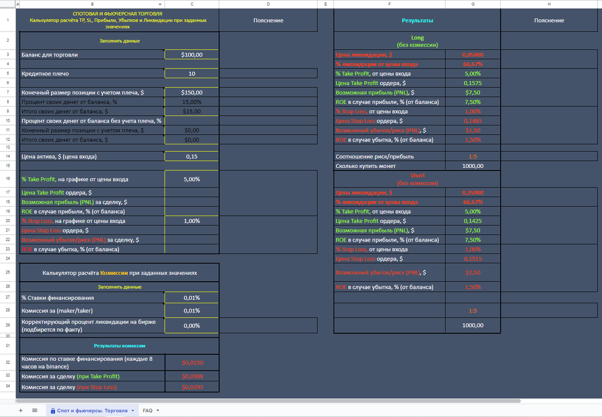 Представляю вам таблицу, которой я лично пользуюсь, чтобы рассчитать всю необходимую информации о позиции во время торговли. В ней можно задать различные начальные параметры и удобно провести анализ для Long и Short сделок.