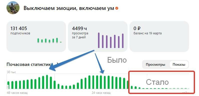 Если до 17 часов публикации с канала показывались алгоритмом в режиме примерно 7000-12000 показов в час, то в промежутке с 17 до 18 часов показы начали сильно падать, а после 18 часов стало даваться в среднем лишь 700-1200 показов в час, то есть произошло падение ровно в десять раз на ровном месте.