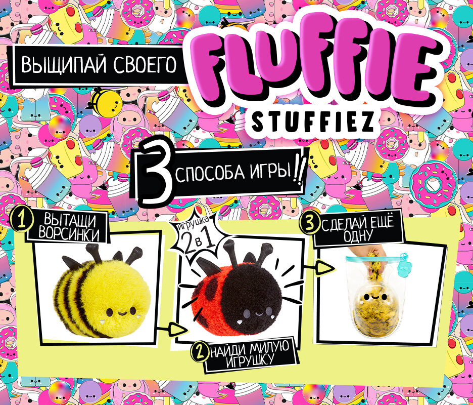 Флаффи Стаффиз (Fluffie Stuffiez) – популярный бренд от компании MGA, предлагающий абсолютно уникальные игрушки, ведь ребенок сможет не просто играть с ними, но и создавать свой собственный дизайн игрушки. Это позволяет не просто сделать процесс игры более увлекательным, но и развивать креативное мышление. ВЫЩИПАЙ СВОЕГО ФЛАФФИ СТАФФИЗ! Каждый ребенок сможет не просто играть со ФЛАФФИ СТАФФИЗ, но и создавать свой собственный дизайн игрушки. Это позволяет не просто сделать процесс игры более увлекательным, но и развивать креативное мышление. Устройте выщипательный челлендж у себя дома! ПРИДУМЫВАЙ БОЛЬШЕ ИГР С FLUFFIE STUFFIEZ 1. Выщипай ворсинки Ребенок может придумать неограниченное количество игр – выщипать игрушку полностью, оставить усы, полоски и другие узоры. 2. Найди мягкую игрушку После того как весь ворс будет выщипан, ребенок обнаружит игрушку в новом цвете или даже в новом обличии! 3. Создай еще одну игрушку Весь выщипанный ворс нужно будет сложить в чехол от игрушки и полу