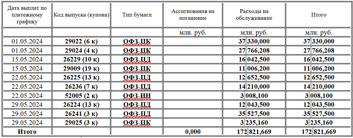 Минфин опубликовал данные о выплатах по ОФЗ в мае 2024 года.