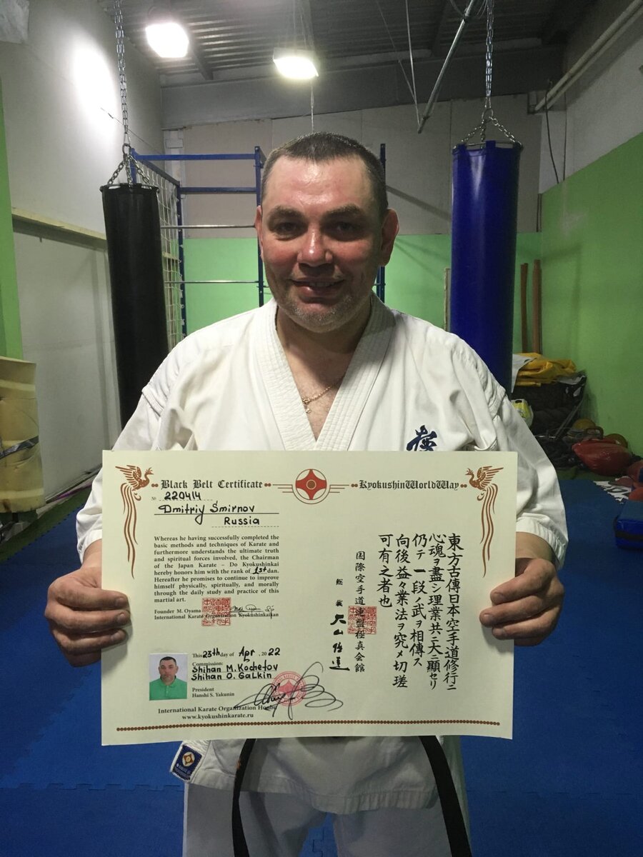 -Здравствуйте! В подростковом возрасте, как и большинство моих сверстников, занимался греко-римской борьбой, немножко тхэквондо, несколько лет занимался ушу, которое привлекало своим разнообразием и таинственностью. Дальше взрослая жизнь без присутствия в ней БИ. В 2012 году, находясь в очередном отпуске, посетила меня мысль, а не заняться ли спортом? Но не хотелось тягать железо, и вспомнил об увлечении юношества, о боевых искусствах. Стал искать секцию в интернете и нашел секцию карате Сен-Э. Так как, больше вариантов не было, направил свои стопы туда. Прозанимался там год-полтора, до осени 2014 года. Поучаствовал в городских турнирах и по карате, ушу-саньда, кобудо (Ниппон кэмпо). Везде был самым возрастным участником, на тот момент было уже 39 лет, выше 2, 3 мест не поднимался, проигрывал молодым по скорости. Да и вес мой, в среднем 107 кг, влиял на подвижность. Хотелось полного контакта, а не игра в «салочки». Так пришел к давней страсти юности - Киокушинкай карате. И нашел клуб у нас в городе. Так с 2015 года и иду по этому Пути.