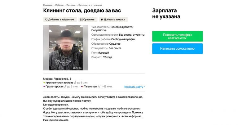 «Доем салаты, закуски, но могу еще и выпить, если угостите, с вашего позволения. Вынесу мусор или даже помою посуду. Цена договоренная», — пишет автор объявления, указывая, что готов работать в районе «Крестьянской Заставы», «Пролетарской» и «Таганской».