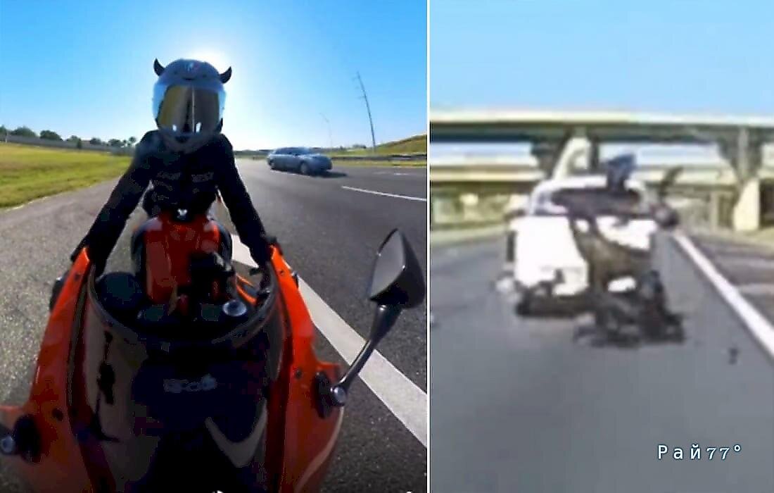Оставшаяся неизвестной любительница острых ощущений, запечатлевающая на камеру GoPro полный неожиданностей заезд на мотоцикле по магистрали в черте города Сэнфорда (штат Флорида, США), стала свидетельницей драматичного приземления своего приятеля в кузове, двигавшегося в попутном направлении пикапа.