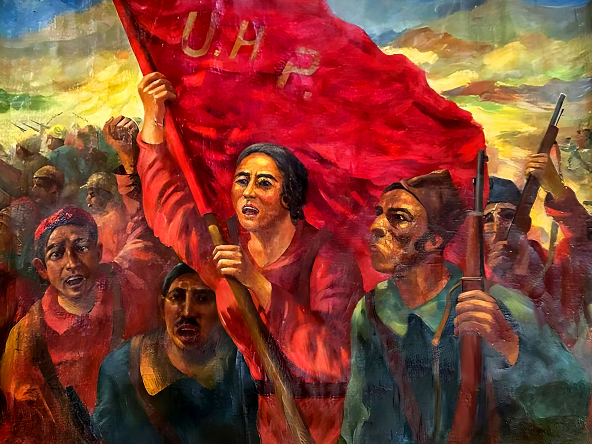Картина «Испания» одно из самых сложных произведений Александра Николаевича Волкова, она стоит особняком и вырывается из ряда тематических работ мастера. Картина написана в 1937 г. когда в Испании уже во всю шла гражданская война. Развернувшиеся боевые действия внутри страны стали результатом политических и социальных напряжений, главными сторонами которой стали республиканцы и националисты. Республиканцы, состоявшие в основном из рабочего класса, крестьян и мелких ремесленников, стремились к проведению радикальных реформ, в то время как националисты, поддерживаемые военным и традиционалистическими силами, выступали за сохранение монархии и централизованный авторитарный строй. Война приняла крайне жестокий и разрушительный характер. На фоне бомбардировок, боев и репрессий погибли сотни тысяч гражданских лиц. В конечном итоге победу одержали националисты, возглавляемые генералом Франко, что привело к установлению диктаторского режима в Испании, действовавшего до середины 1970-х годов.