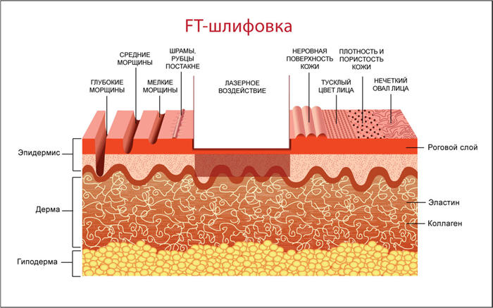 При прогреве глубоких слоёв кожи стимулируется образование новых коллагеновых комплексов, что придаёт коже подтянутый и молодой вид. Параметры лазерного воздействия устанавливаются с помощью компьютера. Все это позволяет обеспечить высокий уровень контроля глубины воздействия лазерного луча на кожу, что является основным преимуществом лазерной шлифовки кожи.