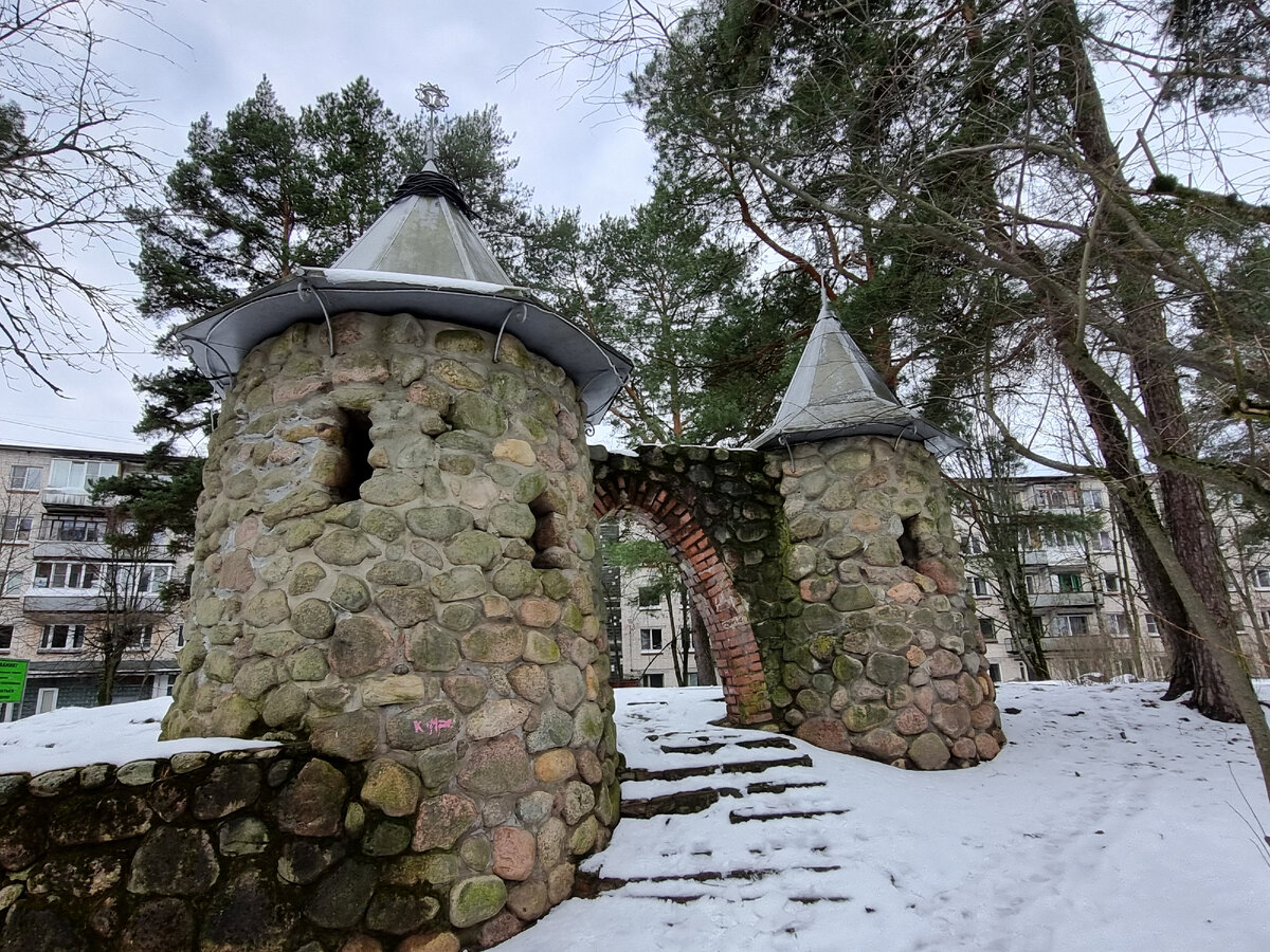 Сосновый Бор - город в Ленинградской области, известный прежде всего находящейся там атомной станции. Нам нравится этот спокойный зелёный городок с удачно вписанными городскими кварталами в своеобразную природу южного побережья Финского залива. Там есть где погулять и что посмотреть. Прошлая поездка была осенью 22 года, а теперь поехали ранней весной. Когда планировалось путешествие стояли солнечные дни. Но к выходным выпал снег. И наша прогулка неожиданно оказалась наполовину зимней, хотя гуляли в апреле. В Сосновый Бор мы приехали на скоростной электричке с Балтийского вокзала, на ней и уедем вечером обратно в Петербург. Свой маршрут начали с осмотра Малой Копорской крепости - детской площадки, находящейся в удручающем состоянии. Детский городок возведён во дворе жилых домов и напоминает своего собрата - Копорскую крепость (крепость Копорье - одна из сохранившихся крепостей в Ленинградской области, памятник каменного военно-оборонительного зодчества). Андерсенград - следующая локаци