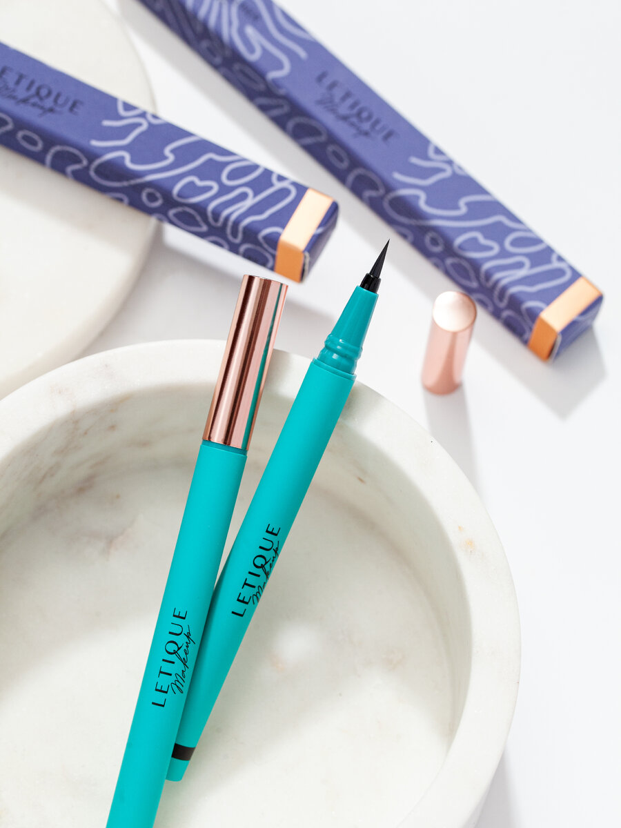 Для стрелок будем использовать жидкую подводку для глаз ULTRA GRAPHIC, так как аппликатор позволяет создавать четкие прямые линии и легко регулировать ширину стрелки. Для более мягких линий — карандаш для глаз WATERPROOF EYE PENCIL.